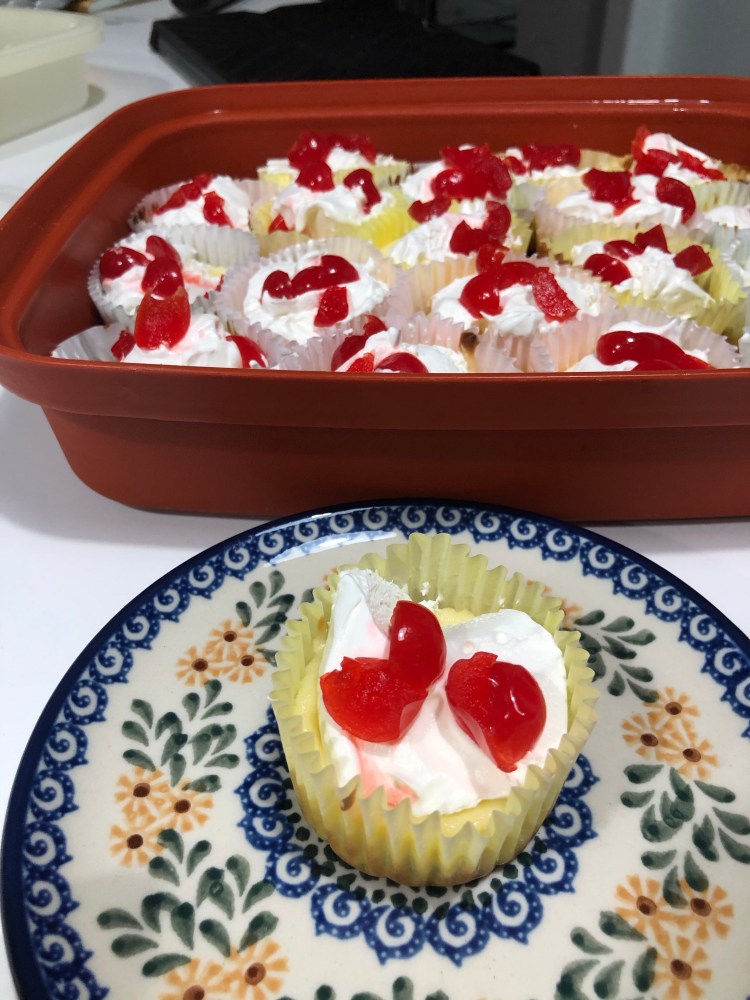 - Once cool, top each cheese cake with cool whip and a maraschino cherry
