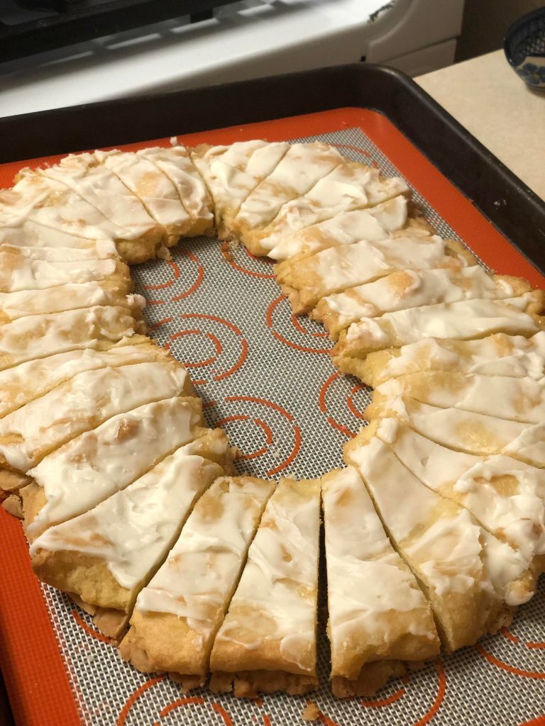 - To make frosting combine 1 TB melted butter, 1 cup powdered sugar and 1/2 tsp almond extract. Add milk a little bit at a time until the mixture is spreadable but not so thin that it will run off. Spread the frosting on the pastry.